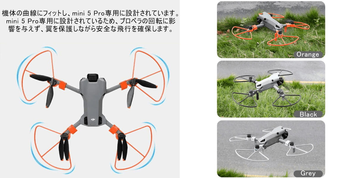 サードパーティ会社では、DJI Mini 5 Proのプロペラガードとランディングギアのセット販売をしています。
