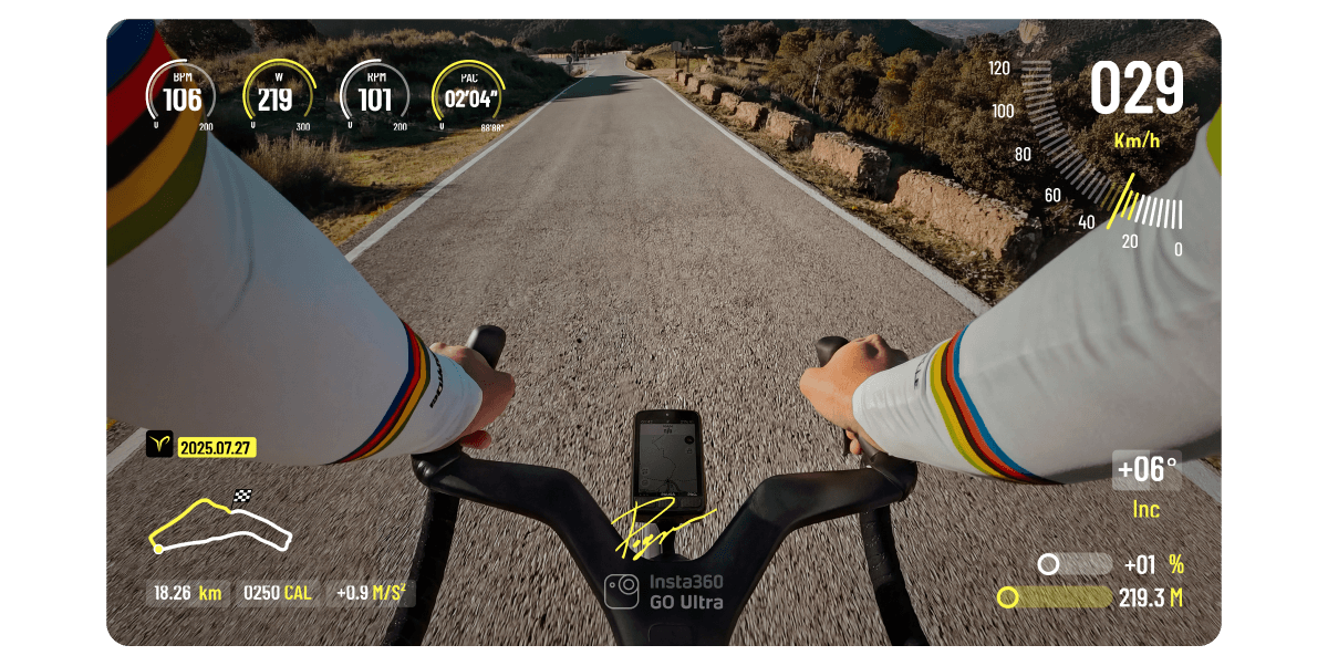 Strava、Magene、Garmin、COROS、Huaweiのデータと連携し、速度・傾き・心拍数などを映像に重ねて表示。ポガチャルスタイルでライドを再現しました。