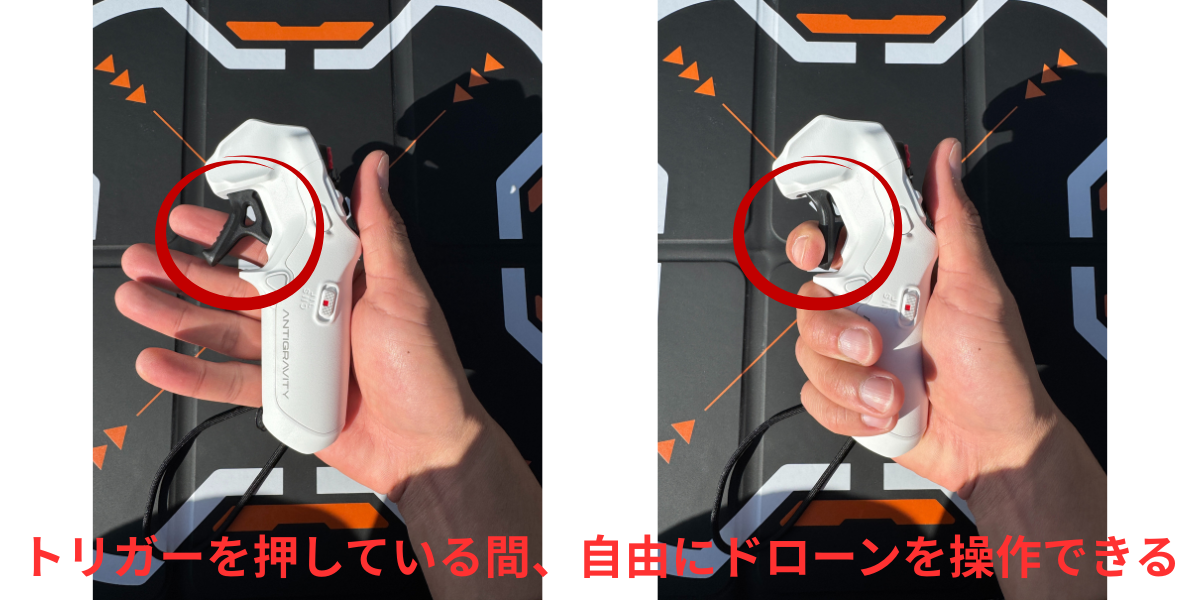 Antigravity A1の世界初の操作モード「フリーモーション」では、グリップモーションコントローラー(送信機)をレーザーポインターのように向けて操作できます。複雑な操作が必要ないため、誰でも簡単に、思いのままにドローンを操縦できます。