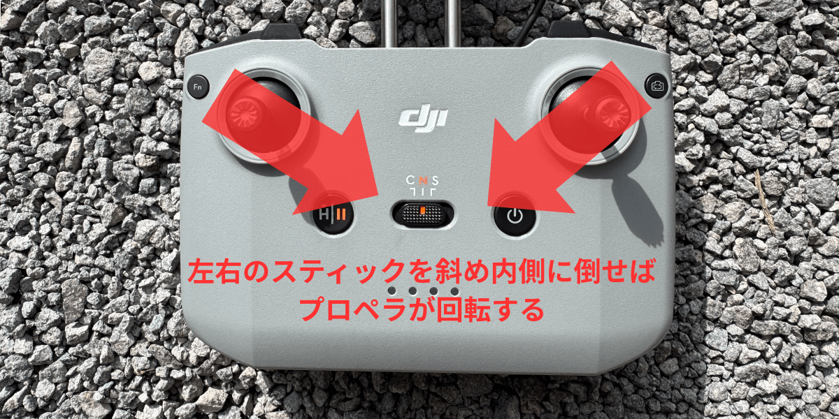 まず、左右のスティックを斜め内側に倒します(以下画像参照)。プロペラが高速回転しますので、左スティックを上に倒してドローンを離陸させましょう。