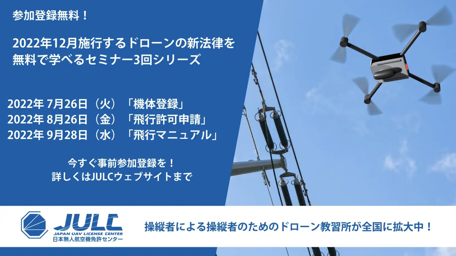 ドローンの関連許認可申請とソリューション開発を専門とするバウンダリ行政書士法人(本社:宮城県、代表行政書士:佐々木 慎太郎)と日本無人航空機免許センター株式会社(本社:東京都中央区、代表取締役:松本 篤史、以下:JULC)は、2022年12月施行するドローンの新法律を無料で学べるセミナーを、3回(7月26日、8月26日、9月28日)にわたり開催します。
