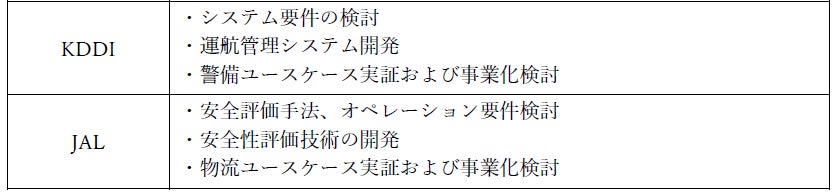 本取り組みでは、KDDIとKDDIスマートドローン株式会社(本社:東京都港区、代表取締役社長:博野 雅文)が共同開発しているドローンの遠隔制御・自律飛行を実現する運航管理システムに、JALが培ってきた空の移動に関わる安全管理・運航管理などの航空運送事業のオペレーション・技術・知見を組み合わせることで、ドローンの「1対多運航」を可能にする飛行制御システムの開発を進めるとともに、日本各地における実証を実施していきます。