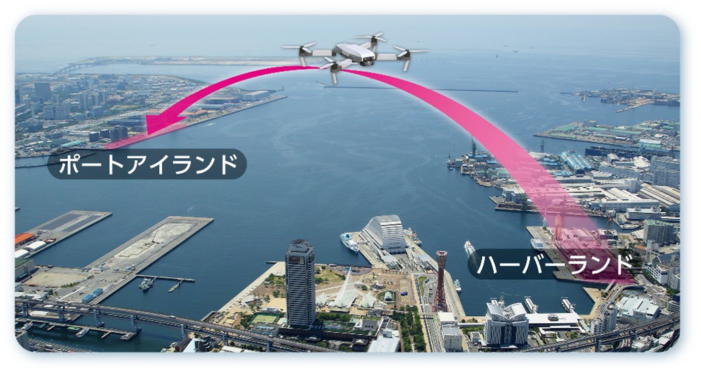 ②ドローンの運搬箱に商品を積み込み、高浜岸壁から離陸し、神戸港を横断、約5分後にポーアイしおさい公園に着陸します。