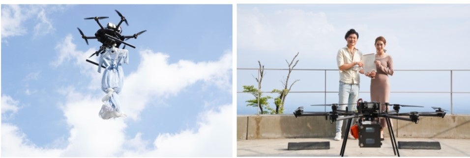 約850m先の本部から空輸されてきた婚約指輪でのサプライズプロポーズや、同じく空輸で届いた食材でのBBQパーティーなど、お客様たちがコテージ滞在中に気軽に食材や追加ドリンクなどを注文している場面を想定して映像化しています。ドローン社会実装後の風景を具体的に想定した演出として話題となりました。