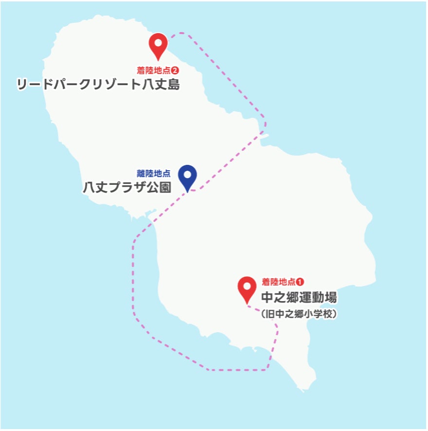 交通が不便な地域に住む島民への買物支援や観光施設との連携を想定し、ドローンによる配送先を2ヵ所(①中之郷運動場、②リードパークリゾート八丈島)設置し、店舗が多く集まる地域にほど近い八丈プラザ公園からドローンで配送しました。