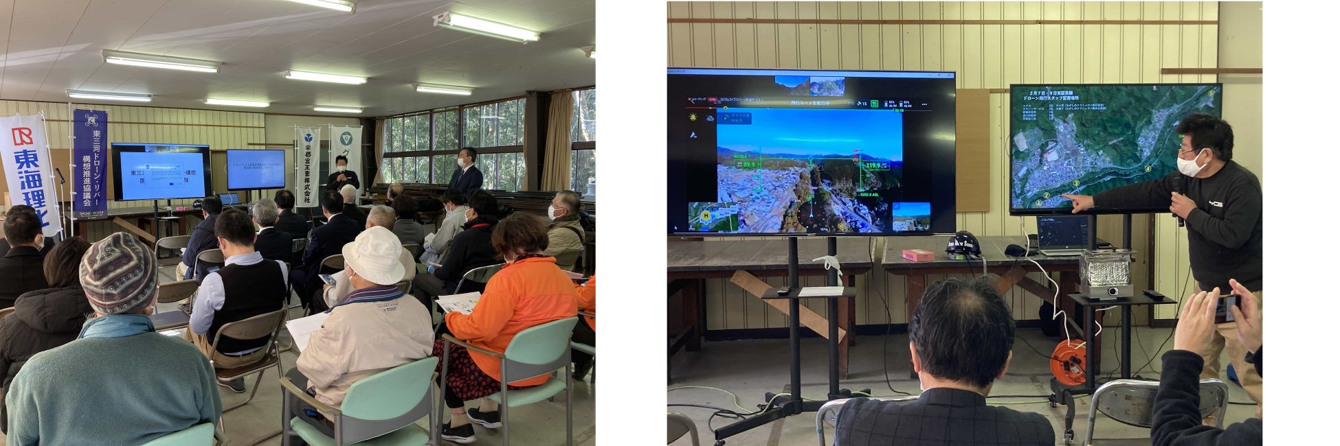 ドローンの第三者上空飛行を実現しドローン配送を社会実装するには、安全な運航管理体制が求められます。この度の実験では、国が求める要件を満たすための安全管理の管制室機能のプロトタイプを考案し実験しました。具体的にはドローンからの空撮映像やテレメトリーデータによる「空の道の安全確認」と配送先の「空の駅の安全確認」を同時に遠隔監視するシステム及びネットワークを構築し、そのデモンストレーションを各町の管制拠点(乗本公民館)から実況中継を行うことで、地域住民と見守りました。