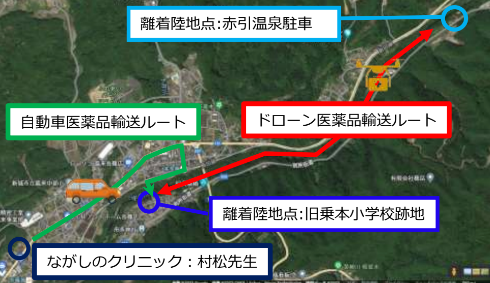 新城市「ながしのクリニック」の医師と新城市大野地区の患者とのオンライン診療を行い、医師から処方された 医薬品をグリーンサービスが自動車で乗本地区のドローン離着陸場まで搬送しました。その後医薬品をドロ ーンの医薬品専用ボックスに格納し、宇連川上空を北東に大野地区までドローンにて空輸し、大野地区の患者の駐車場までお届けしました。