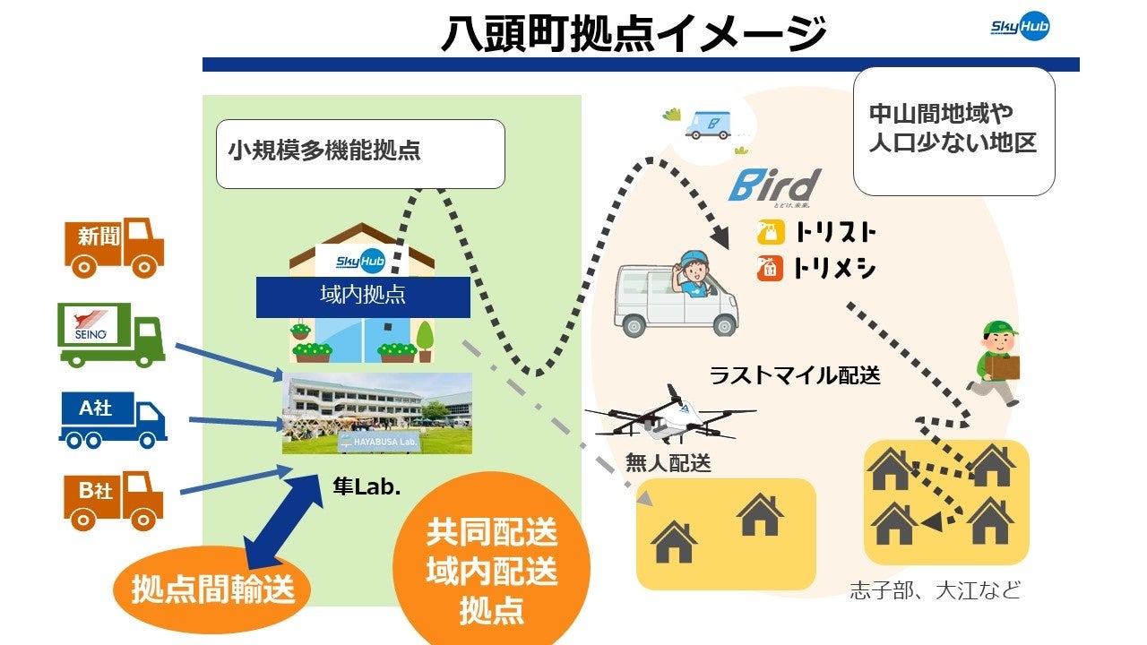 今回の実証実験は、中山間地域のラストワンマイルへの輸送手段に、セイノーHDとNEXT DELIVERYが開発・推進する陸上輸送とドローン配送を連結する新スマート物流SkyHub ®のシステムを導入するだけでなく、超地域密着型の生活プラットフォームの「Bird」と連携します。