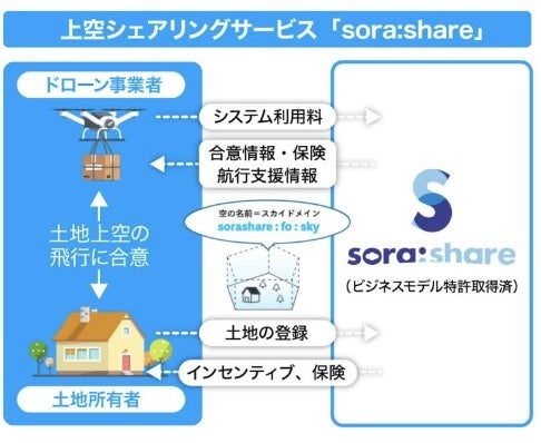 またソラシェアは3次元空間(緯度・経度・⾼度のデータセット)に名称を与える「スカイドメイン」という仕組みを導⼊し、世界中の空を識別します。空のURLともいうべき「スカイドメイン」に紐づくデータベースには、空域の3次元情報以外にもドローン⾶⾏の合意状況、インセンティブの内容から、⼟地や建物の管理者情報、障害物情報、気象などのリスク要素に⾄るまで格納でき、それらの情報には必要に応じてセキュアな環境から外部からのアクセスも可能な設計となっています。