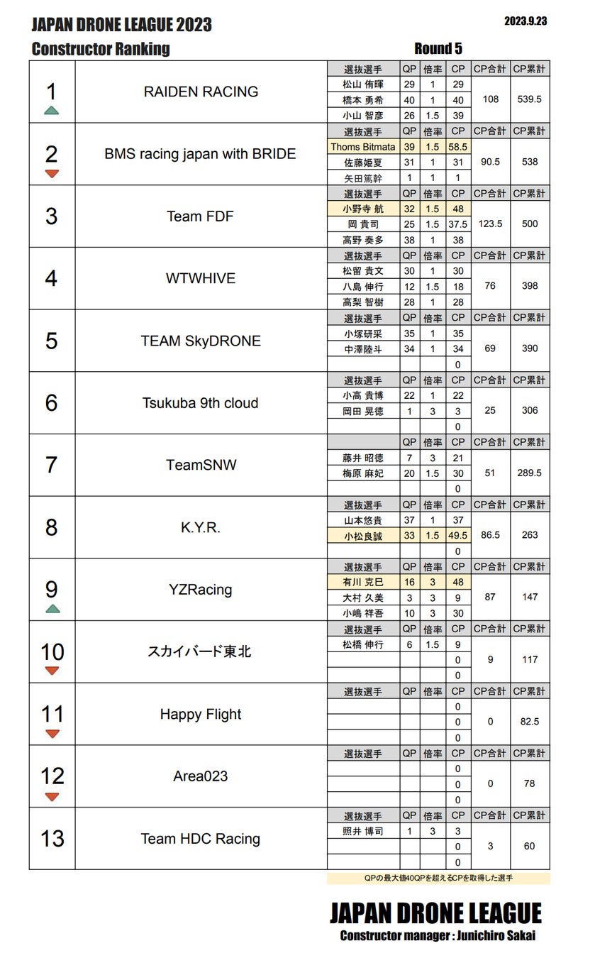 ライデンはコンストラクターパイロットとして、松山 侑暉(プロクラス)Saqoosha(エキスパートクラス)橋本 勇希(プロクラス)の3選手に加え、メカニックに梅溪 得道が参加し、今大会でも安定の速さを魅せ、チーム全体で108ポイントを獲得しました。首位のBRIDEもオーストラリアから世界トップクラスのパイロット、Thomas Bitmatta選手(エキスパートクラス)を招聘し、万全の体制で臨んだものの、これまでチームを牽引してきた矢田選手が今シーズン初となる予選敗退となりチーム全体で90.5ポイントと大きくポイントを落とす結果になりました。