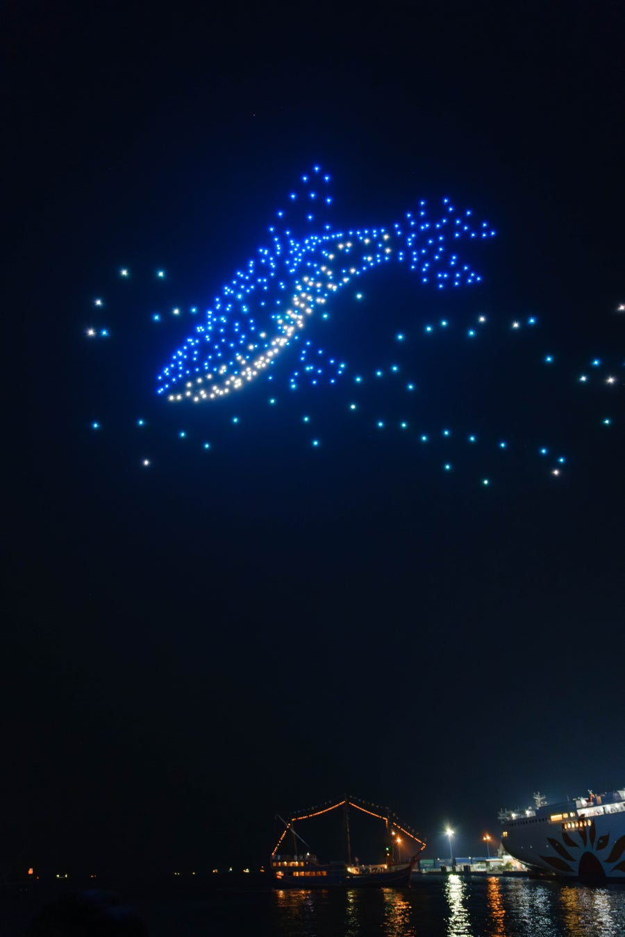 ドローンショー冒頭では、近隣船舶へ注意喚起を行う「KEEP OUT」を表示しました。こちらはドローンライトを活用した海上沿岸警備(コーストガード)で、国内では初の試験的実施となります。