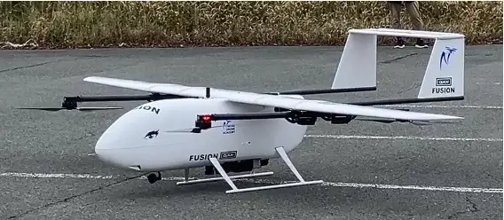 以下写真は、VTOL固定翼UAV「QUKAI MEGA FUSION 3.5」(機体下部にLiDARが搭載)です。