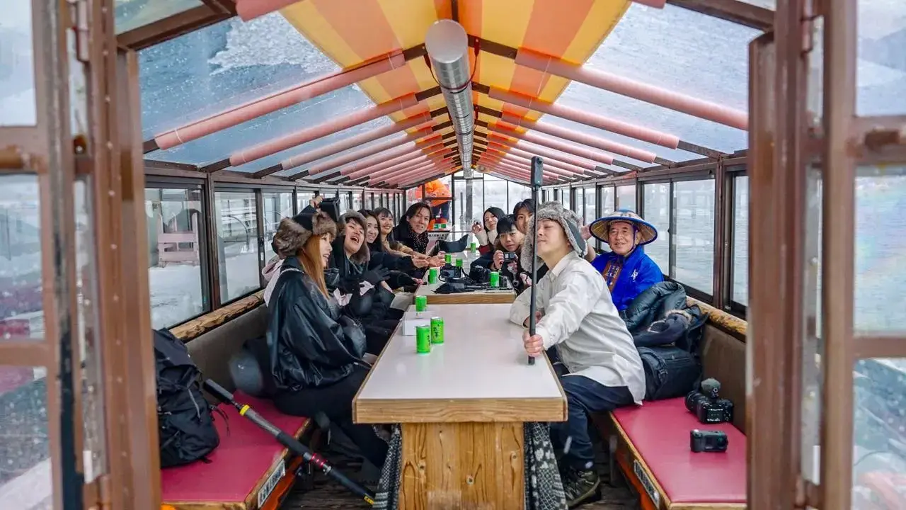 初日は、最上川での舟下りからスタート。名物「こたつ舟」で暖を取りながら、船頭の舟唄に耳を傾け、約1時間をかけて雪化粧した峡谷を下りました。