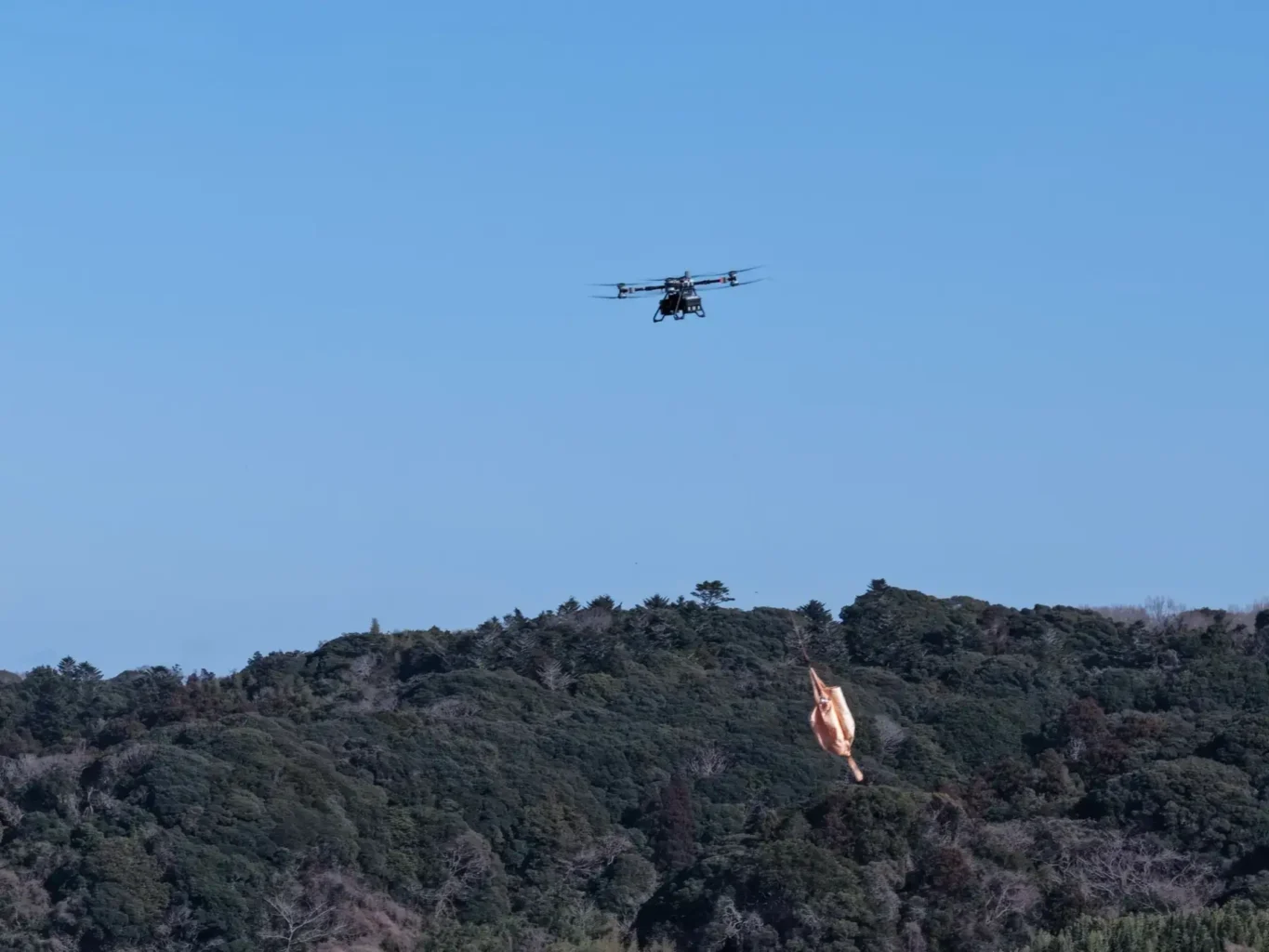 また2025年8月・9月には、山岳地で、登山道しかない山小屋への物資輸送を実施。麓から約6.7km、標高約2,200m地点まで30kgの物資を約7分で搬送し、別日には登山道補修用資材をウインチ+ワイヤーでピンポイントに降ろす運用も行っています(標高1,400m→2,200mの条件で30kg運搬はIDA調べで国内初の試み)。