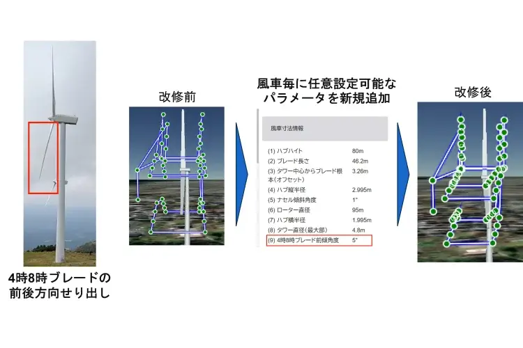 従来の『BLADE Check』では1フライトで1ブレード(0時方向)を撮影する仕様であったため、全てのブレードを点検するには、撮影ごとにブレードを120°ずつ回転させる作業が必須となっていました。現場作業のさらなる省力化を目指し、1フライトで全方位をカバーする新機能の追加開発を行いました。