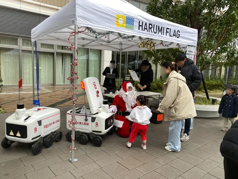 クリスマスには、「HARUMI FLAG」で開催されたイベントに出展しました。こちらではクリスマスプレゼントとしてお菓子やステッカーを配布し、お越しいただいた皆様と楽しく交流させていただきました。そのほか、「楽天無人配送」をより知っていただくために地元の小学校へお伺いして出張授業を行ったりしています。