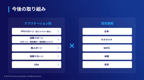 テラドローンは、今後、防衛分野の無人システムを中心とした領域において、さらなる市場ニーズの顕在化と拡張が進んでいくと捉えております。主に以下の三点をテラドローンにおける重点戦略として取り組んでいきます。