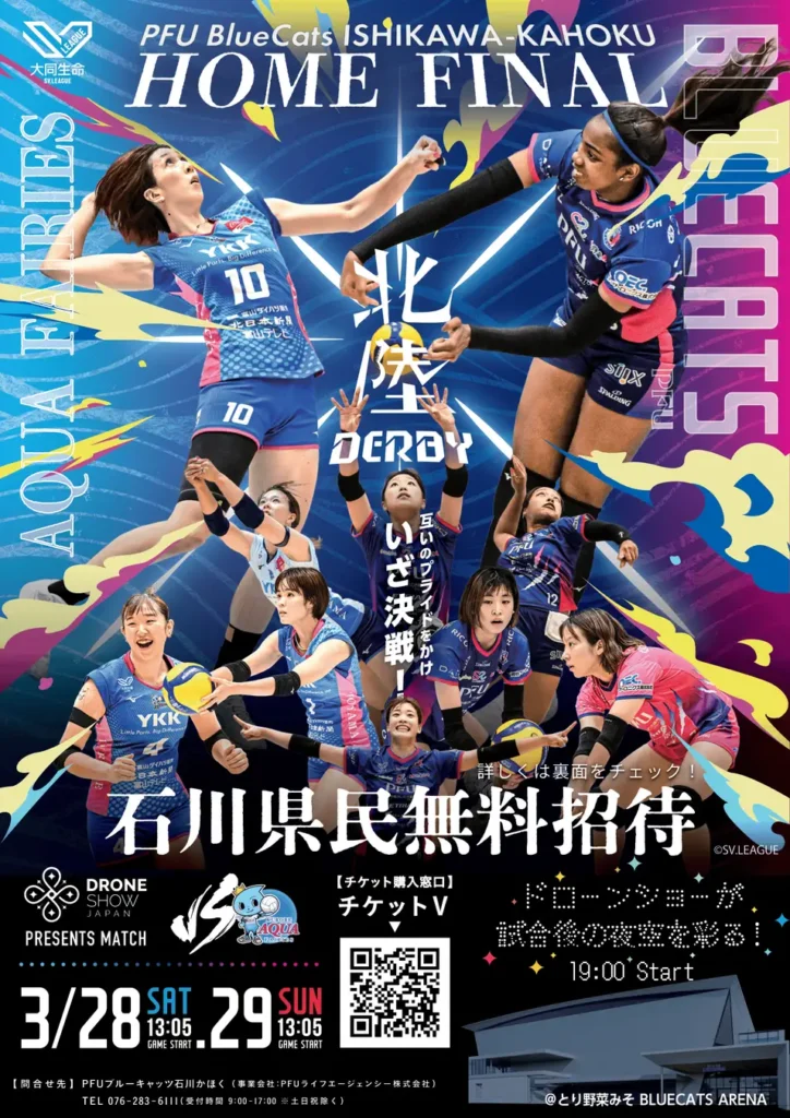 株式会社ドローンショー・ジャパン(本社:石川県金沢市、代表取締役:山本 雄貴、以下:ドローンショー・ジャパン)と、世界最高峰を目指す大同生命SV.LEAGUEに所属する女子プロバレーボールチーム PFUブルーキャッツ石川かほくは、2026年3月28日(土)・29日(日)に開催するホーム最終節において、プロバレーボールとして国内初となる屋外ドローンショー「BlueCats Night Canvas supported by Drone Show Japan」の開催を決定しました。