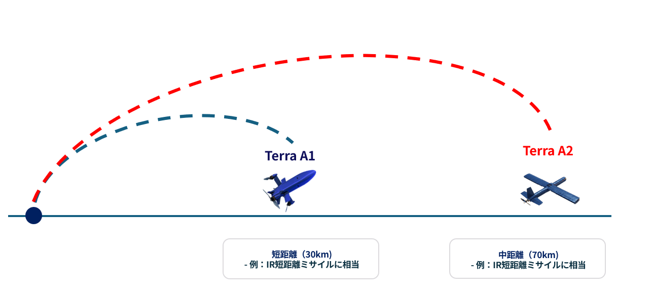 - 固定翼型 Terra A2:前段防衛(広域監視、長時間哨戒、長距離迎撃、早期対処)