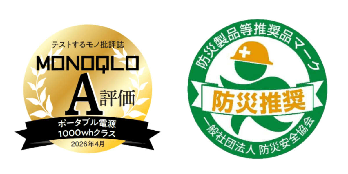さらに、「テストするモノ批評誌MONOQLO(2026年4月号)」では1000Whクラスのポータブル電源部門において「A評価」を獲得、また、防災必要性・安全性・機能性において、防災安全協会の評点をクリアし「防災製品等推奨品認証」を受けています。